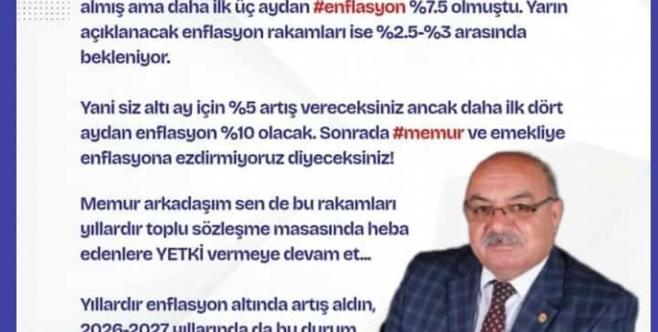 Yarın Ekim ayı enflasyon rakamları açıklanacak. Memur ve emeklileri zaten biliyorda herkes bilsin... Kamu çalışanları ve emeklileri ikinci altı ay için SADECE %5 artış almış ama daha ilk üç aydan #enflasyon %7.5 olmuştu. Yarın açıklanacak enflasyon rakamları ise %2.5-%3 arasında bekleniyor. Yani siz altı ay için %5 artış vereceksiniz ancak daha ilk dört aydan enflasyon %10 olacak. Sonrada #memur ve emekliye enflasyona ezdirmiyoruz diyeceksiniz! Memur arkadaşım sen de bu rakamları yıllardır toplu sözleşme masasında heba edenlere YETKİ vermeye devam et... Yıllardır enflasyon altında artış aldın, 2026-2027 yıllarında da bu durum devam edecek. Kamu çalışanları ve emeklileri ikinci altı ay için SADECE %5 artış almış ama daha ilk üç aydan #enflasyon %7.5 olmuştu. Yarın açıklanacak enflasyon rakamları ise %2.5-%3 arasında bekleniyor. Yani siz altı ay için %5 artış vereceksiniz ancak daha ilk dört aydan enflasyon %10 olacak. Sonrada #memur ve emekliye enflasyona ezdirmiyoruz diyeceksiniz! Memur arkadaşım sen de bu rakamları yıllardır toplu sözleşme masasında heba edenlere YETKİ vermeye devam et... Yıllardır enflasyon altında artış aldın, 2026-2027 yıllarında da bu durum devam edecek.