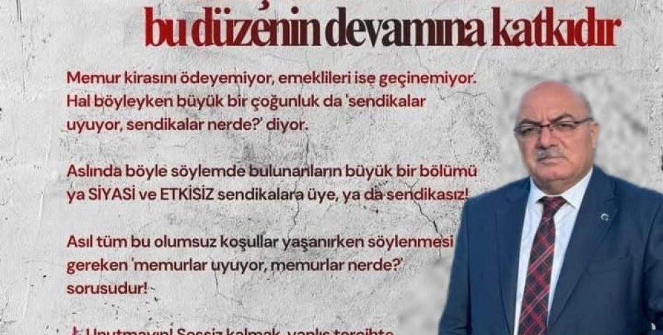Memur kirasını ödeyemiyor, emeklileri ise geçinemiyor. Hal böyleyken büyük bir çoğunluk da 'sendikalar uyuyor, sendikalar nerde?' diyor. Aslında böyle söylemde bulunanların büyük bir bölümü ya SİYASİ ve ETKİSİZ sendikalara üye, ya da sendikasız! Asıl tüm bu olumsuz koşullar yaşanırken söylenmesi gereken 'memurlar uyuyor, memurlar nerde?' sorusudur! ❗ Unutmayın! Sessiz kalmak, yanlış tercihte ısrar etmek bu düzenin devamına katkıdır. Artık sormanın değil, sorumluluk almanın zamanıdır...