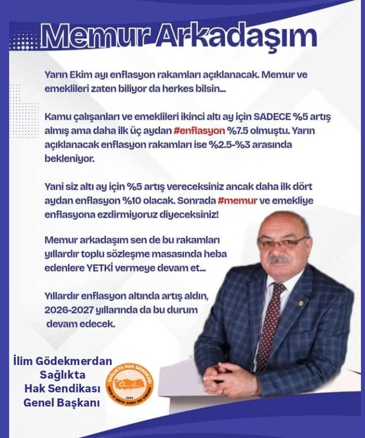 Yarın Ekim ayı enflasyon rakamları açıklanacak. Memur ve emeklileri zaten biliyorda herkes bilsin... Kamu çalışanları ve emeklileri ikinci altı ay için SADECE %5 artış almış ama daha ilk üç aydan #enflasyon %7.5 olmuştu. Yarın açıklanacak enflasyon rakamları ise %2.5-%3 arasında bekleniyor. Yani siz altı ay için %5 artış vereceksiniz ancak daha ilk dört aydan enflasyon %10 olacak. Sonrada #memur ve emekliye enflasyona ezdirmiyoruz diyeceksiniz! Memur arkadaşım sen de bu rakamları yıllardır toplu sözleşme masasında heba edenlere YETKİ vermeye devam et... Yıllardır enflasyon altında artış aldın, 2026-2027 yıllarında da bu durum devam edecek. Kamu çalışanları ve emeklileri ikinci altı ay için SADECE %5 artış almış ama daha ilk üç aydan #enflasyon %7.5 olmuştu. Yarın açıklanacak enflasyon rakamları ise %2.5-%3 arasında bekleniyor. Yani siz altı ay için %5 artış vereceksiniz ancak daha ilk dört aydan enflasyon %10 olacak. Sonrada #memur ve emekliye enflasyona ezdirmiyoruz diyeceksiniz! Memur arkadaşım sen de bu rakamları yıllardır toplu sözleşme masasında heba edenlere YETKİ vermeye devam et... Yıllardır enflasyon altında artış aldın, 2026-2027 yıllarında da bu durum devam edecek.